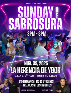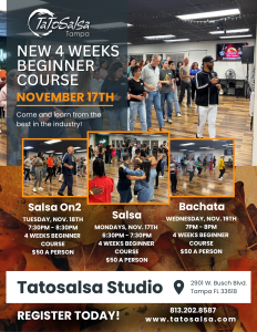 Welcome to TaToSalsa Studio based in the Tampa Bay area. We currently offer group classes in Salsa, Mambo(On2), and Bachata. We also provide personal private lessons in Salsa, Salsa On2 (Mambo), Bachata, and Cha Cha. TaToSalsa special dance workshops, student performance team, dance socials and special events are also available. Visit the “CALENDAR” tab on this site to find out the next start date. We look forward to meeting you!