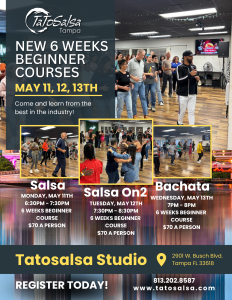Welcome to TaToSalsa Studio based in the Tampa Bay area. We currently offer group classes in Salsa, Mambo(On2), and Bachata. We also provide personal private lessons in Salsa, Salsa On2 (Mambo), Bachata, and Cha Cha. TaToSalsa special dance workshops, student performance team, dance socials and special events are also available. Visit the “CALENDAR” tab on this site to find out the next start date. We look forward to meeting you!